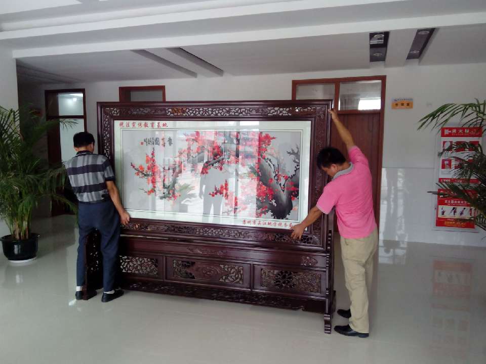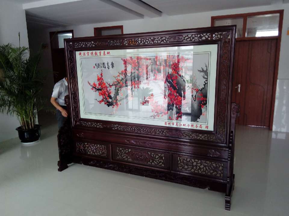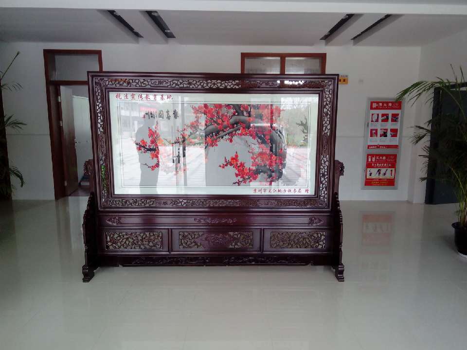 為了加強(qiáng)稅法教育的宣傳工作,蘇州吳江橫扇小學(xué)被設(shè)立為稅法宣傳教育基地,為此,蘇州吳江地方稅務(wù)局為了更好的普及稅法知識(shí)和積極做好宣傳工作,在蘇州嬌古蘇繡藝術(shù)品有限公司特定了一款梅花報(bào)春圖的雙面繡屏風(fēng),屏風(fēng)已順利完工,現(xiàn)由嬌古蘇繡工作人員送抵吳江橫扇小學(xué)并進(jìn)行安裝。