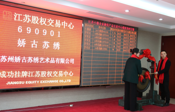 ?? 2016年12月9日,蘇州嬌古蘇繡藝術(shù)品有限公司掛牌上市儀式在江蘇股交中心隆重舉行。簡稱“嬌古蘇繡”,股權(quán)代碼“690901”。伴隨著莊重而響亮的鑼聲,嬌古邁出了跨越式的一步。???? ?? 就嬌古蘇繡掛牌成功,公司董事長張奇?zhèn)ハ壬硎尽肮纠響?yīng)將完善企業(yè)治理機(jī)構(gòu),提升企業(yè)競爭力放在首位,不辜負(fù)資本市場對嬌古的認(rèn)可及支持。這也是公司一個飛躍式進(jìn)步,一個重要里程碑。嬌古員工們將其作為強(qiáng)大的動力,更好、更快的為廣大客戶服務(wù)。規(guī)范和健全企業(yè)發(fā)展機(jī)制,是我們的目標(biāo)。但我們相信,掛牌成功,對企業(yè)的規(guī)范化、影響力有著不可小覷的力量。在此,我僅代表全體公司人員,感謝股交中心長期以來的支持與信任,感謝所有工作人員辛勤的付出!”
