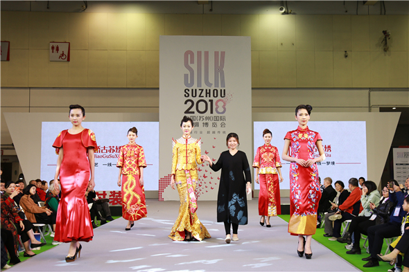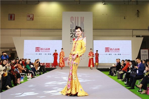 于蘇州博覽中心開展的為期三天的2018中國(蘇州)國際絲綢博覽會已謝幕,展會上精品與亮點頻出,蘇繡作為兼具實用性與觀賞性的中國國粹,乃是本次國際絲綢博覽會上展出的重頭戲。 其中,嬌古·孔蒙“燦時”秀場在4月5日上午10:15分進行的新品發(fā)布引起了廣泛的矚目。作為出品方的嬌古蘇繡已是第三次參加絲綢博覽會,此番攜手原創(chuàng)設計師孔蒙聯(lián)合推出多款蘇繡定制婚服新品,則賺足了人氣,迅速成為業(yè)界熱議的中心,而價值28.8萬的蘇繡定制婚服初次亮相更將現(xiàn)場掀起一輪高潮,為觀眾帶來了嶄新而震撼的蘇繡體驗。 據了解,這件價值28.8萬的褂皇從設計到成衣,前后花費的時間一年,涉及十幾道制作工序,全程皆由手工完成,整體設計除了匯萃蘇繡工藝精髓之外,還蘊含著“幸福美滿、稱心如意、龍鳳呈祥、青云直上”等多重寓意。