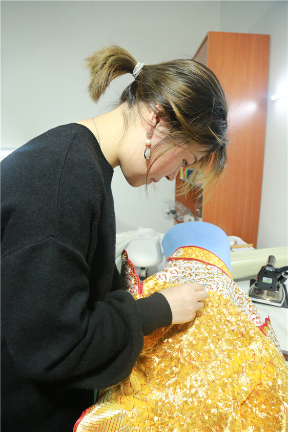 此件褂皇利用魚尾設計將女子的婀娜多姿盡情舒展,盡顯高貴而又不失矜持。繡花部分最為講究,平繡、盤金、立體盤金等多重繡花工藝均得到了淋漓盡致的體現(xiàn),整體反復而條理明晰、一目了然,由多位經驗豐富、技藝老到的繡娘全程手工協(xié)作完成。傳統(tǒng)蘇繡文化精神與工藝精髓在這件褂皇上得到了升華,并以生動的具象為大眾帶來直觀的視覺沖擊。