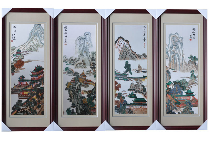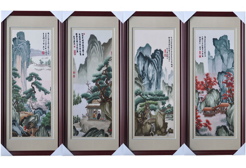 嬌古蘇繡 手工刺繡工藝品 裝飾壁畫四件套 山水蘇繡畫