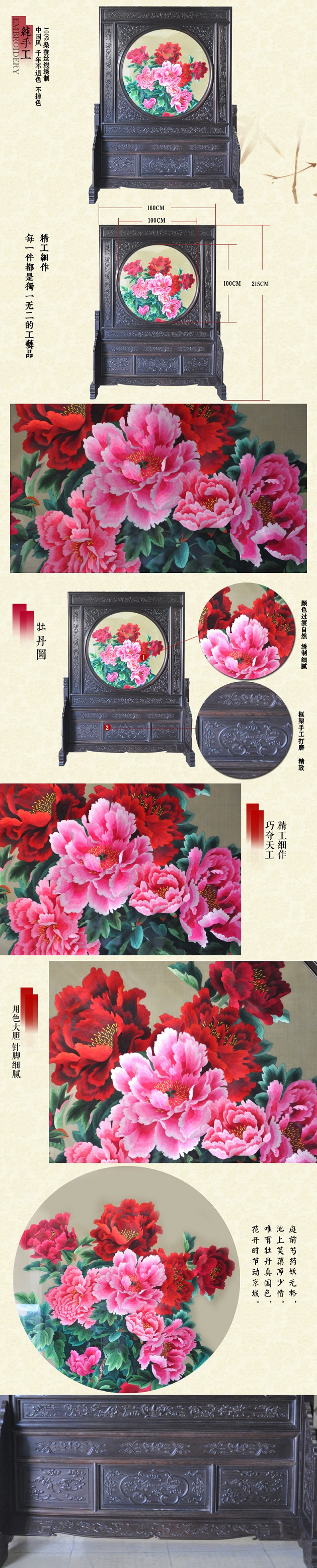 【產(chǎn)品名稱(chēng)】:牡丹(雙面繡) (作品代碼:p-1514) 【產(chǎn)品規(guī)格】:圖案尺寸100cm的圓 外框整體尺寸寬160cm,高215cm 【產(chǎn)品工藝】:工刺繡 【產(chǎn)品材質(zhì)】:真絲面料+雞翅木+桑蠶絲線+玻璃 【產(chǎn)品包裝】:木箱包裝,用海綿包扎,確保運(yùn)輸安全 【出廠價(jià)】:24000元 【產(chǎn)品運(yùn)輸】:我司負(fù)責(zé)發(fā)往客戶(hù)指定地點(diǎn),蘇州附近城市可送貨上門(mén)! 【產(chǎn)品說(shuō)明】:牡丹雙面繡屏風(fēng),是由蘇州工藝師耗時(shí)數(shù)個(gè)月精心手工刺繡而成,刺繡圖案以國(guó)花牡丹為題材繡工精細(xì),簡(jiǎn)約大方,顏色搭配均勻過(guò)渡自然,屏風(fēng)的框架選用進(jìn)口的雞翅木為料,是蘇繡屏風(fēng)中的珍稀作品。是居家和辦公的裝飾品之一!歡迎親臨嬌古蘇繡展示廳觀看實(shí)物! .jpg)